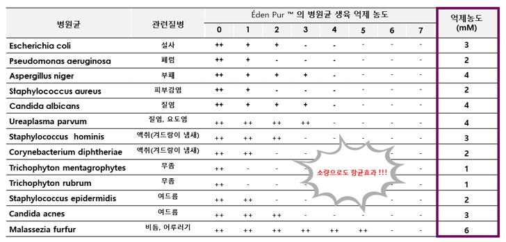 <락토바실러스 발효여과물[Éden Pur ™] 의 병원성 미생물들에 대한 항균력시험 결과>